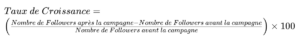 - Taux de Croissance : Le pourcentage d’augmentation du nombre de followers pendant et après la campagne. En effet, il indique la capacité de la campagne à attirer de nouveaux abonnés et à accroître la portée de l’influenceur.
